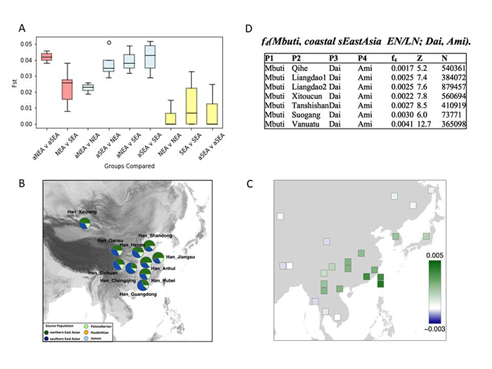 研究所涉及新石器时代早期人群样本,包括来自北方山东、内蒙古地区5个遗址(扁扁洞、小荆山、小高遗址、博山遗址、裕民遗址)距今9500-7700年的7个个体,及南方福建、台湾海峡2个遗址(奇和洞、亮岛)距今8400-7600年的3个个体。通过研究这些人群的基因组发现,在沿着黄河流域直到西伯利亚东部草原的人群,至少从9500年前起都携有一种以新石器时代山东个体(图3)为代表的古北方人群成分而中国大陆沿海及台湾海峡岛屿人群至少从8400年前起就携有一种以新石器时代福建及其毗邻岛屿个体为代表的古南方人群成分(图1C和D),且这两种成分截然不同(图3A)。然而随着时间的推移,东亚大陆南北方人群之间的这种差异性和分化程度逐渐缩小(图4A),这种变化暗示着自新石器时代以来南北方之间频繁的人群迁移与混合。此外,在8300-7700年前山东人群中发现古南方人群联系(图2B)及在约8300年前亮岛1号人发现有少量古北方人群的影响(图2D),反映南北方人群已经开始互动。