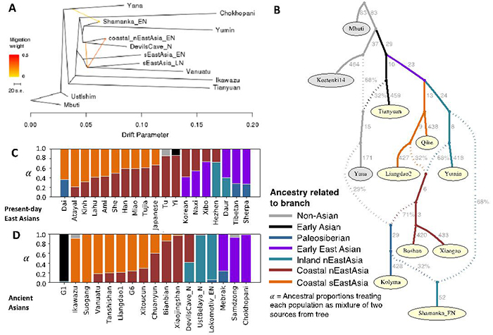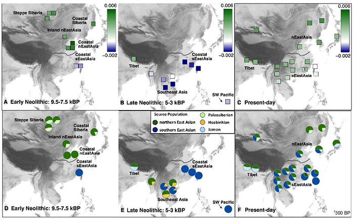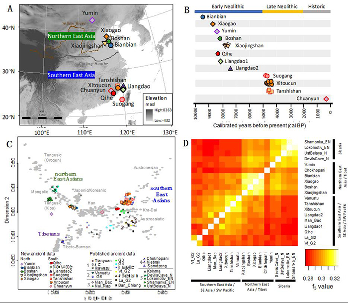 研究所涉及新石器时代早期人群样本,包括来自北方山东、内蒙古地区5个遗址(扁扁洞、小荆山、小高遗址、博山遗址、裕民遗址)距今9500-7700年的7个个体,及南方福建、台湾海峡2个遗址(奇和洞、亮岛)距今8400-7600年的3个个体。通过研究这些人群的基因组发现,在沿着黄河流域直到西伯利亚东部草原的人群,至少从9500年前起都携有一种以新石器时代山东个体(图3)为代表的古北方人群成分而中国大陆沿海及台湾海峡岛屿人群至少从8400年前起就携有一种以新石器时代福建及其毗邻岛屿个体为代表的古南方人群成分(图1C和D),且这两种成分截然不同(图3A)。然而随着时间的推移,东亚大陆南北方人群之间的这种差异性和分化程度逐渐缩小(图4A),这种变化暗示着自新石器时代以来南北方之间频繁的人群迁移与混合。此外,在8300-7700年前山东人群中发现古南方人群联系(图2B)及在约8300年前亮岛1号人发现有少量古北方人群的影响(图2D),反映南北方人群已经开始互动。